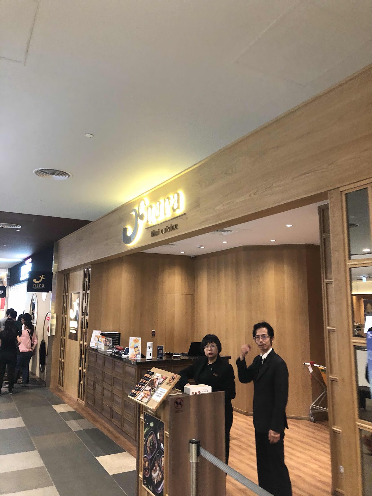 Nara Thai Cuisine的位置在美食區2樓,老爺爺排隊泡芙的旁邊。"NARA Thai Cuisine"的創辦人主要是兩位對烹飪有興趣的女性企業家,店名"NARA"也就是取創辦人之一"Narawadee Srikarnchana"的名字,此外NARA梵語又有泰國婦女的意思,因為泰國婦女穿著傳統服飾時,手臂會配戴金色手鐲裝飾,所以NARA便以這個像手鐲形狀的圖樣來當作品牌LOGO。